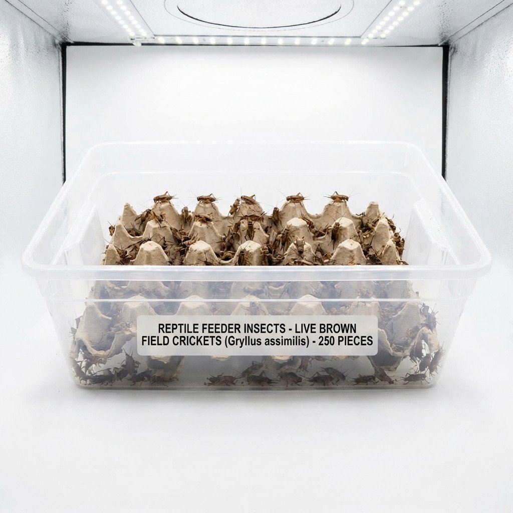 Pack of 500 Gryllus assimilis field crickets. High-quality live feeder crickets for reptiles, amphibians, and other insectivorous animals. Available in medium and large sizes.