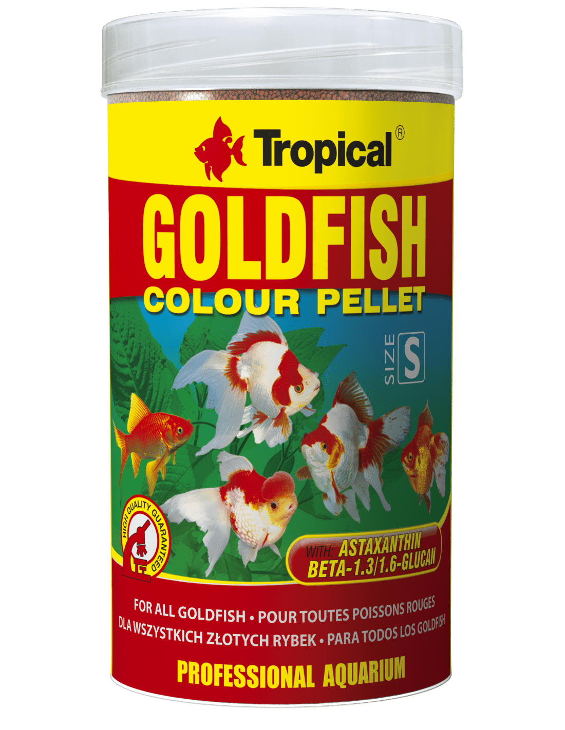 Colour-enhancing sinking pellets for goldfish and other cold-water ornamental fish. Enriched with astaxanthin and natural carotenoids for vibrant colours. Easy-to-digest formula. By Tropical.