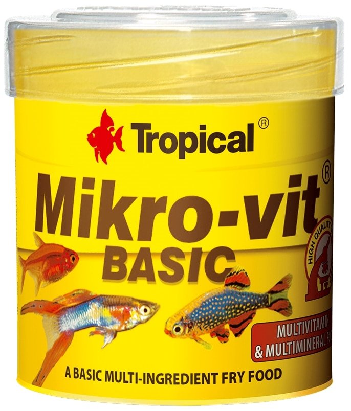 Tropical Mikrovit Basic (50ml/32g) — micro-sized granules for small tropical fish and fry. Complete daily food with vitamins and minerals for healthy development.